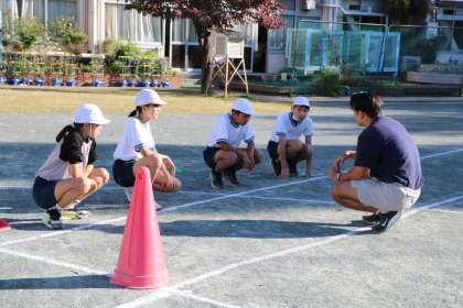 リレー選手は何やら作戦の時間か?選手と先生が真剣に話し合ってからスタートです。