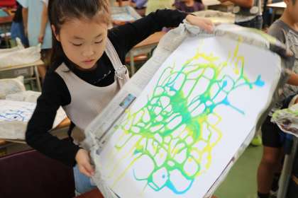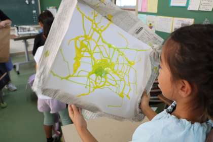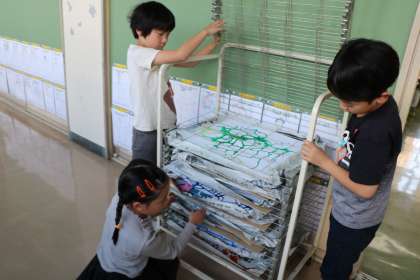 偶然性ももちろんありますが、画用紙を動かう向きを一定にすると面白い模様にもなってきます。乾燥棚に入れた後も自分の作品が気になり