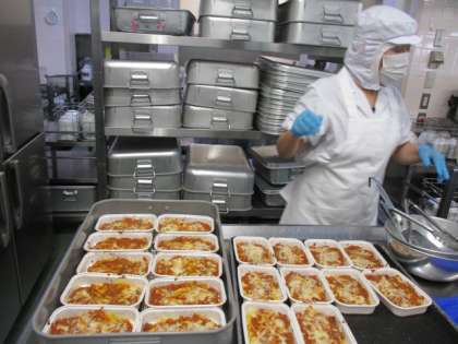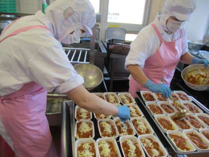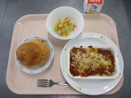 ゆでた幅の広い生パスタ、ミートソースにホワイトルウを入れたクリーミーなソース、チーズを重ねてオーブンで焼いて作りました。朝からたまねぎをじっくり炒めるいいにおいが給食室からしていました。手作りのラザニアをこどもたちに喜んでもらえたらうれしいです。