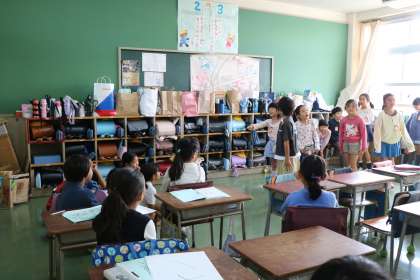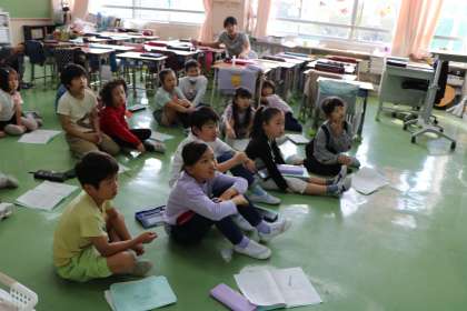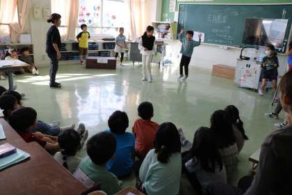 2年生学芸会の様子です。自分たちの演技を動画に撮り振り返っている教室もあります。