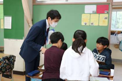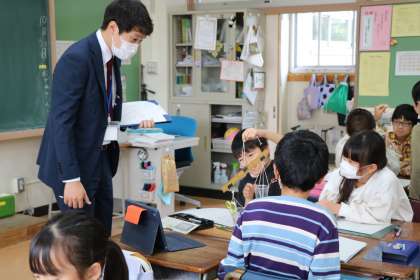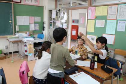 算数の「重さ」の学習です。先生手作りのてんびんを使って、重さのはかり方を考えています。子供たちの良い気づきがたくさんあり、学習が深まりました。