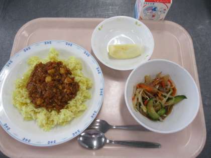 今日はひよこ豆が入ったドライカレーライスです。豆は一般的にマメ科に属する植物の種子で、食用のものは世界に70から80種類あります。日本では、大豆や小豆、えんどうまめ、インゲンマメ、ソラマメ、ひよこ豆、レンズ豆などが食べられています。