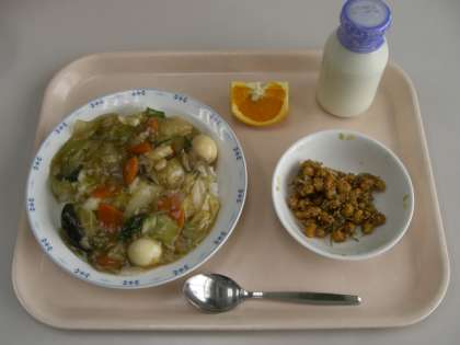 中華丼 大豆とじゃこの甘辛あげ 清美オレンジ 牛乳