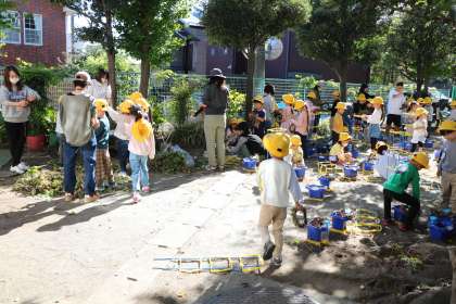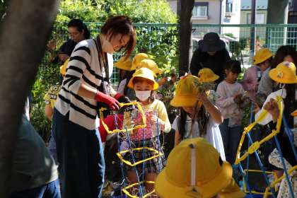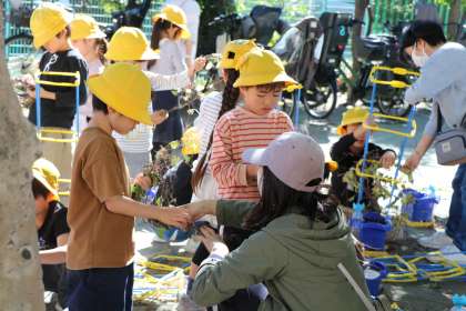 先週サツマイモほりに行った時にもらってきたサツマイモのツルや、手伝いに来てくださった方の家から持ってきてくださった朝顔のツルがとっても助かりました。