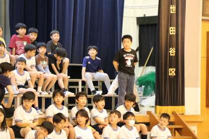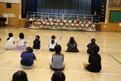 写真は4年生の様子です。自分の立つ場所、小道具を使ったり、動いたりするタイミングを何度も何度も練習し確認します。歌声がとてもきれいです。