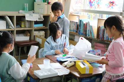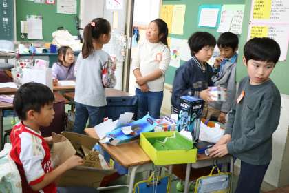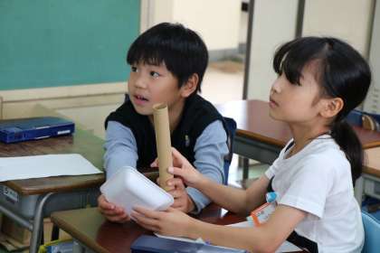 2年生生活科「あそんで ためして くふうして」の様子です。持ち寄った材料でどのような楽しいおもちゃを作ろうか計画を立てている様子です。