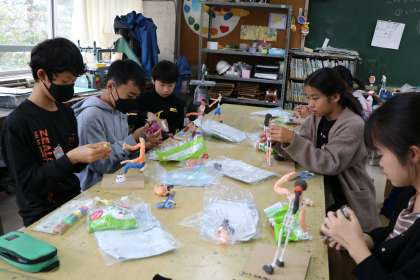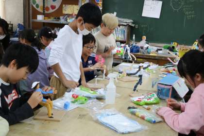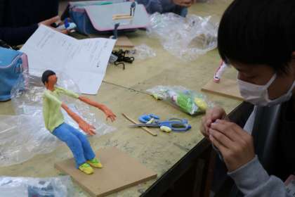 6年生図工「こんな大人になりたいな」の様子です。何をしているところか、ポーズは決まったので、少しづつ洋服で肉付けをしていきます。真っ白な紙粘土を自分のイメージ通りの色にするのが大変なのだそうです。