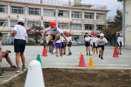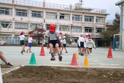 踏切場所の少し前に低いコーンにゴム紐をつけて上に跳ぶ感覚を身に着けます。何回か練習するうちに、みるみる飛距離が伸びていきます。