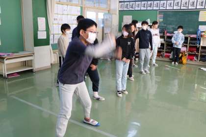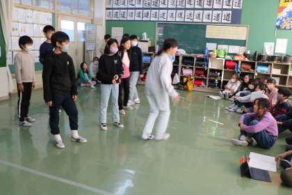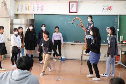 「今のすごくいい!!」と声をかけながら練習の成果を見て、さらにまた練習をしています。子どもたちがとても楽しそうに役になりきっています。