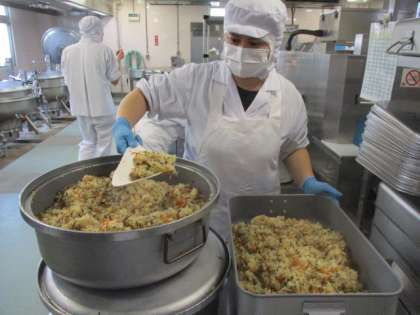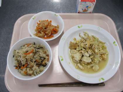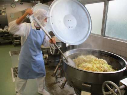 今日の給食は沖縄県の郷土料理です。マーミナーチャンプルのマーミナーとは、沖縄の言葉で「もやし」のことです。しりしりはすりおろす動作の「すりすり」を表す沖縄県の方言です。沖縄県では、専用のしりしり器という大きなおろし金のような道具を使っているそうです。給食では千切りにしました。3枚目の写真はチャンプルを炒めている様子です。