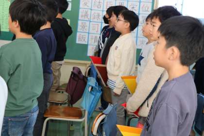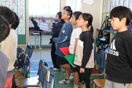 4年生の様子です。学級で学芸会の練習をしています。全員の言葉や動きがぴたりと合うことにこの演目の良さがあります。子どもたちの動きやセリフのあやふやなところを確認しながら、最後の詳細練習です。