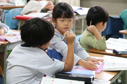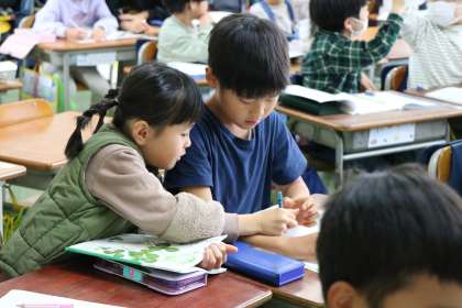 「では友達と相談タイム!」と先生が声をかけると近くの友達と、話し合いや、確認が始まります。すぐに顔を見合わせたり、額を寄せ合って相談する姿に、良い友達関係ができているクラスなのだなと感じます。