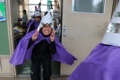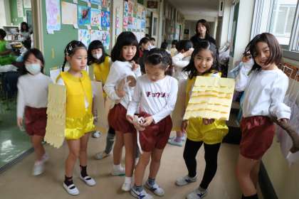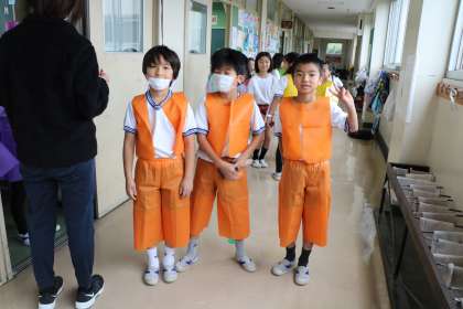 2年生の教室前を通ると、これから体育館に練習に出発する子たちに会いました。今日は衣装を着て会場に入るところから練習です。