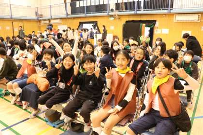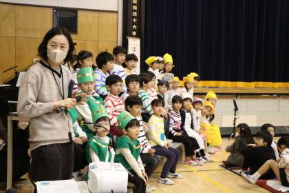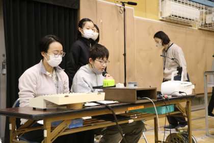 準備が整いました。放送席には高学年放送委員が先生と一緒に司会進行します。