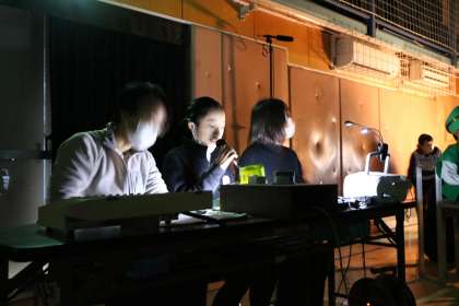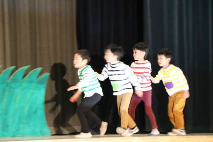 1年生の演技が始まりました。舞台袖では、たらいアングルの効果音を打つためにスタンバイしている子もいます。