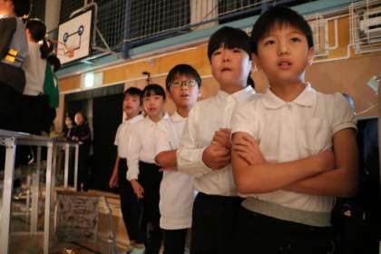 3年生の演技が始まりました。ひな壇の後ろでは、次の出番のために待機しながらも、一生懸命みんなと一緒に歌を歌う姿が見られます。