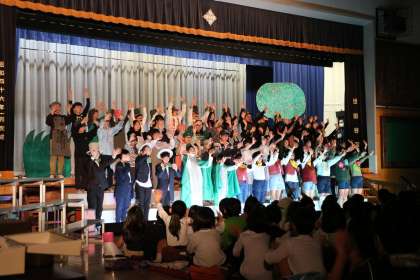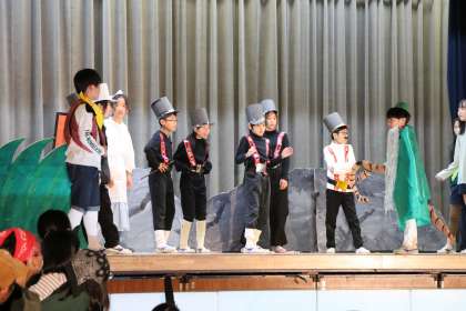 5年生の劇の後、給食です。退場して教室に戻る1年生が泣いています。どうしたのか聞くと、5年生の劇に感動したのだそうです。「優しいライオネルが・・・」と、また泣かせてしまいました。