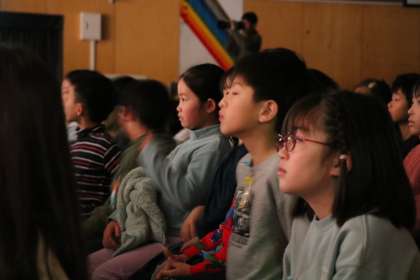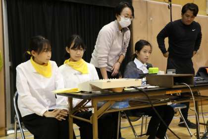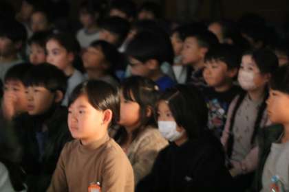 アナウンスの後、6年生の劇が始まりました。6年生の演技を、じっと見つめる下級生です。エルコスが不純物入りのエネルギーチャージ飲料を飲もうとすると「あ〜飲んじゃダメ〜」という悲鳴が!!