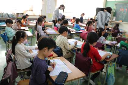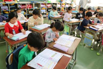 1年生算数の様子です。練習問題の答え合わせをみんなでやっています。3つの足し算まで勉強が進んできました!1年生頑張っています。