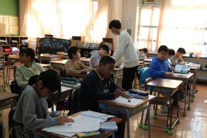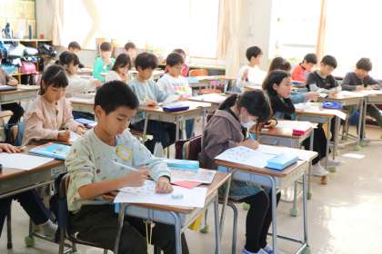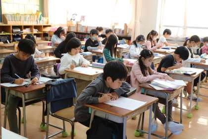 3年生算数「分数」まとめ学習の様子です。練習問題に集中して取り組んでいます。子どもが真剣に取り組む横顔はかわいいです。