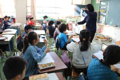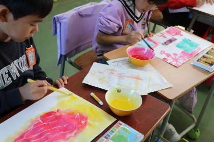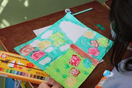 2年生図工「なにがでてくるかな」の様子です。白い紙に白いクレヨンで何やら描いています。何が出てくるかな?絵の具を塗ってからのお楽しみです。