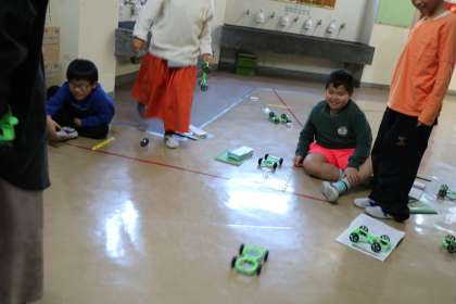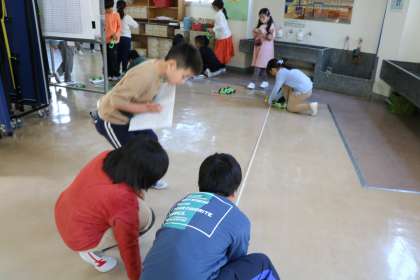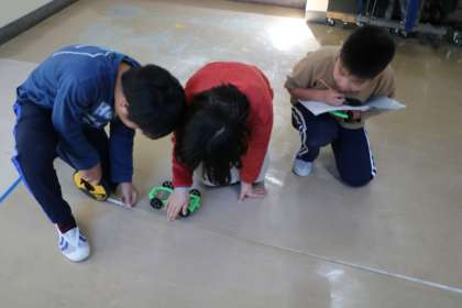 3年生理科「ゴムと風の働き」の実験の様子です。ゴムの力で何メートル車が進むか実験をしています。