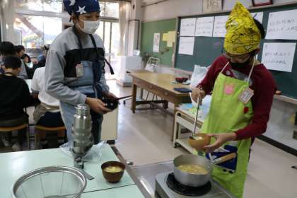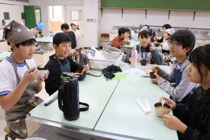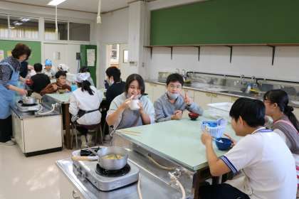 6年生家庭科みそ汁の調理実習の様子です。協力しておいしい味噌汁が完成しました。