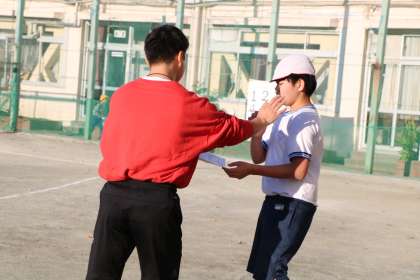 記録用紙を、走り終わった本人に渡し、記録の伸びを一緒に喜んでいます。先生たちも