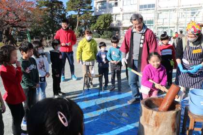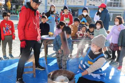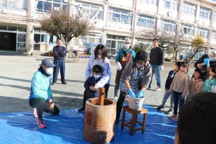 最初大人がよーくこねたら、子どもたちの番です。この、こねるところがとても重要になってくるので、力が入ります。