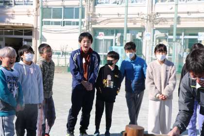 最近先生の運動能力に大感激の子供たち。マラソンの朝練では、いつも見守っているだけと思いきや、一緒に走ってもらうと速いわ、持久力抜群だわ、何をやってもカッコよくできる先生は、今日はもちつきでも抜群の力自慢です。