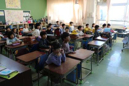 写真は、一生懸命私の話を聞いている3年生の様子です。
