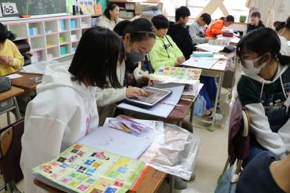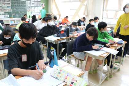 6年生家庭科「クッション」の計画を立てています。動物の顔をデザインしたり、自分のイニシャルや好きな絵をデザインしたり、それぞれ使いたくなるものを考えています。