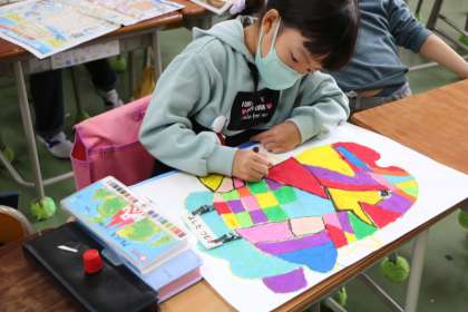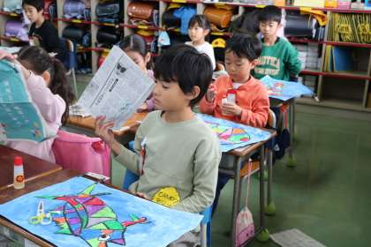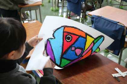 1年生図工「カラフルフィッシュ」の様子です。一生懸命作ったカラフルな海の生き物を、これも一生懸命作った海のイメージの紙に貼っています。どれも家で飾りたくなる作品ばかりです。