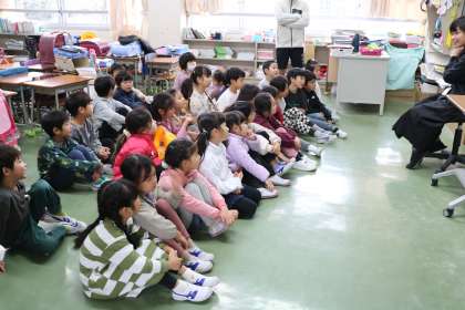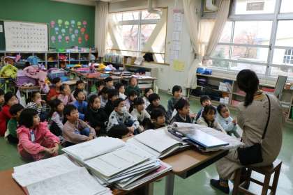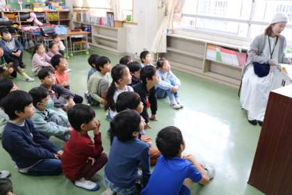 朝学習の時間、家の方に来ていただき絵本の読み聞かせがありました。1年生の様子です。
