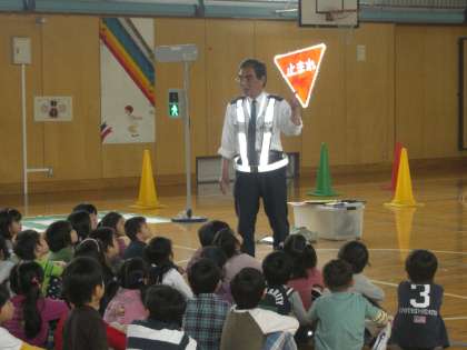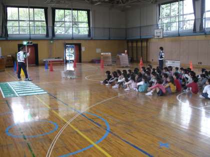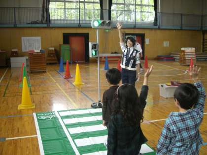 成城警察の方から、正しい道路の歩き方を教えていただきました。真剣に話を聞いて、実際に歩いてみました。