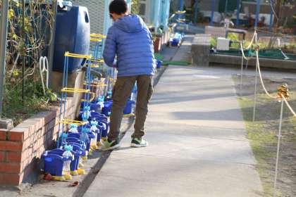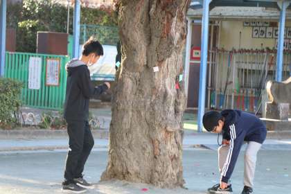 早朝から集会委員が集まり、「宝探し集会」の準備をしています。5×8センチほどの小さな色カードが宝です。わかりにくそうなところや、1・2年生でも見つけやすそうなところまでいろいろなところに宝を隠して?置いて?準備しています。