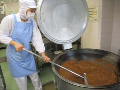 粉のかつおぶしとみりん、しょうゆ、さとう、水、白ごまを合わせてカラカラになるまで釜で炒ってつくります。おいしいふりかけができるように、調理員さんは約30分かけて炒り続けて作ってくださいました。