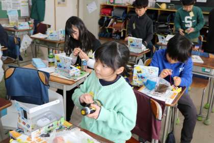 3年生理科の様子です。電気を通すものは何だろう?豆電球が付いたら
