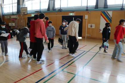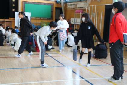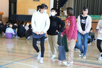 一緒に楽器やフラッグを取りに行き練習開始です。会釈する5年生に、優しく声をかける6年生です。