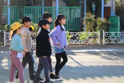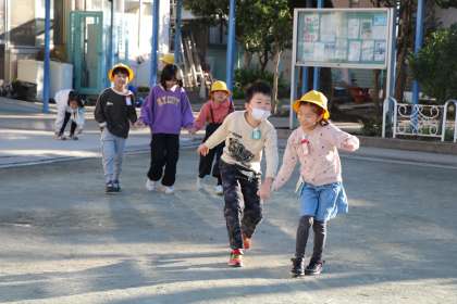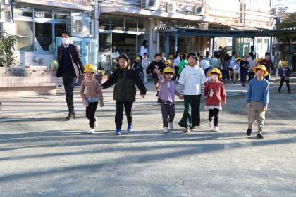 まずは4年生が1年生をお迎えに行っ校庭に集合です。この4年生の姿もとても微笑ましく、優しい良き先輩の顔です。