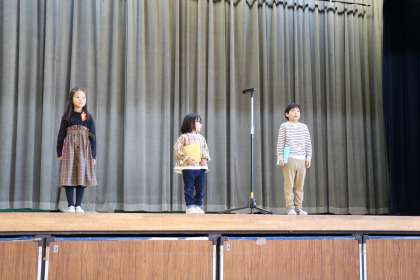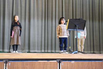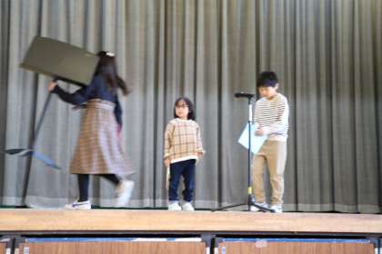 2年生児童代表の言葉は大変立派でした。2学期に頑張った自分のこと、友達のことを振り返り、進級に向けてさらなる目標を3学期に立てていることまで、自分の言葉ではっきり話しました。友達のために道具の出し入れをすることも、子供だけで動けました。3学期の頑張りがさらに楽しみになりました。