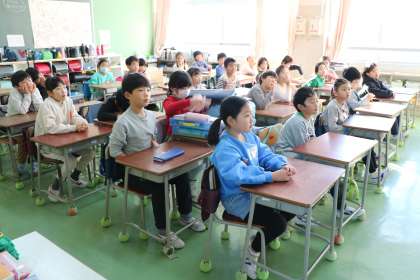 テレビ画面を指さしながら話している先生を、一生懸命に観ながら話を聞く2年生です。廊下から見るだけでは我慢できず、ドアを開けてしまいましたが、それでもしっかり集中して話を聞いています。