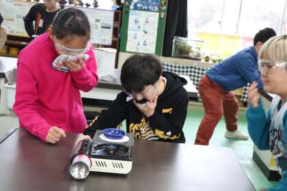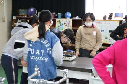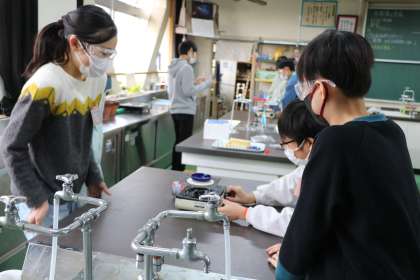 6年生理科の実験の様子です。うすめた塩酸や、アンモニア水を使って実験をします。覗き込んで薬品が目に入ったり、火で熱い思いをしないよう、どの班もルールを守って落ち着いて実験をしています。