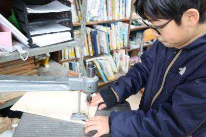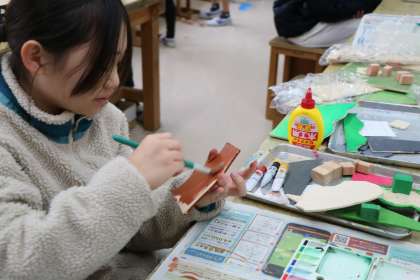 5年生図工「ズラシックパーク」の様子です。あら?何かの映画タイトルのようですが・・・。電動糸のこぎりや、のこぎりで切った材料を使って手前・中央・奥を表現します。色を塗ったりボンドが乾くのを待ちながらアイディアを考えたり、楽しそうです。