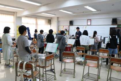 打楽器の様子です。小太鼓のスティックの動かしかたは、手を高速で動かすだけではなく手首を上手に使うのだそうです。何度も何度も練習する子たちです!