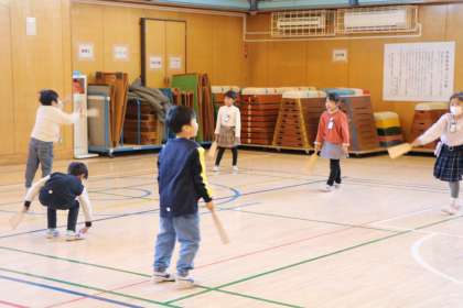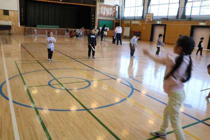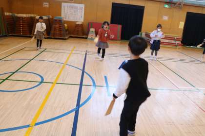 1年生昔遊びの様子です。体育館ではねつきとコマを楽しみました。