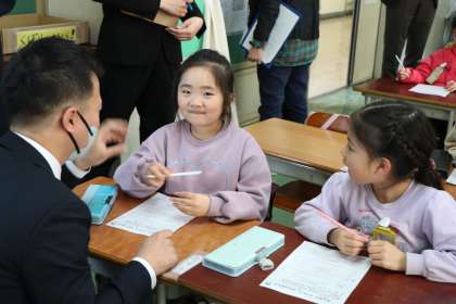 たくさんの先生方に囲まれて、緊張気味の子どもたちです。