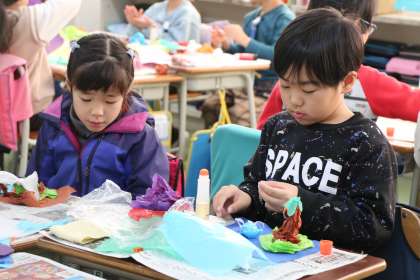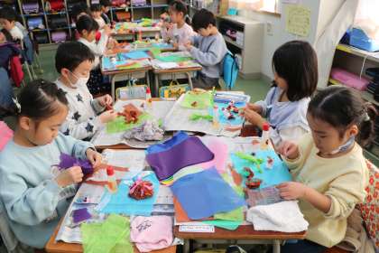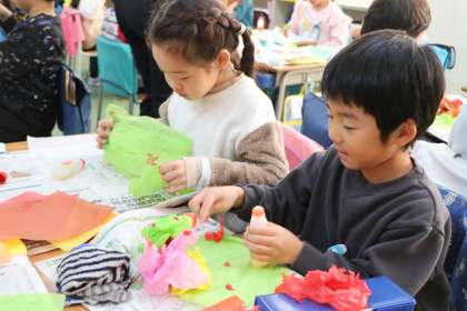 お菓子をたくさん作る子、お庭に見立てる子、ボートを作る子、子どもたちの想像力は無限大です。同じグループのお友達の作品も参考にして、自分の作品作りに生かします。