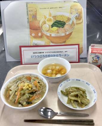 お話給食も今日が最終日です。今日は「いつつごうさぎとゆきのもり」の本に出てくるみそラーメンです。給食の味噌ラーメンには野菜がたっぷり入っています。