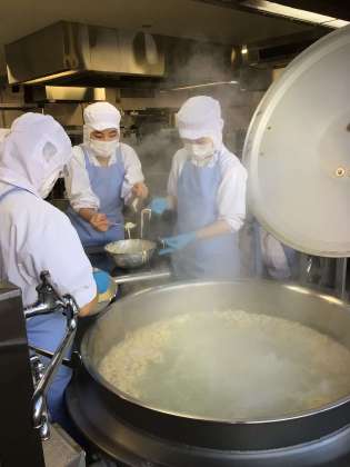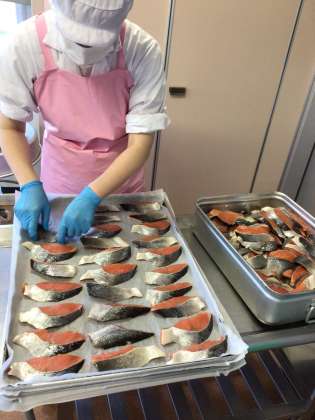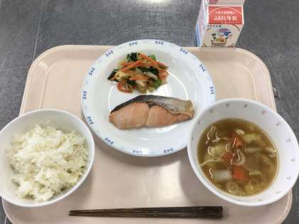 1月24日から30日は全国学校給食週間です。学校給食は明治22年に、山形県の小学校でお弁当をもってこられないこどもたちのためにお昼ごはんをつくって食べさせたのがはじまりと言われています。その時の献立が「ごはん、鮭の塩焼き、つけもの」だったそうです。給食週間献立として鮭の塩焼きとすいとんを作りました。